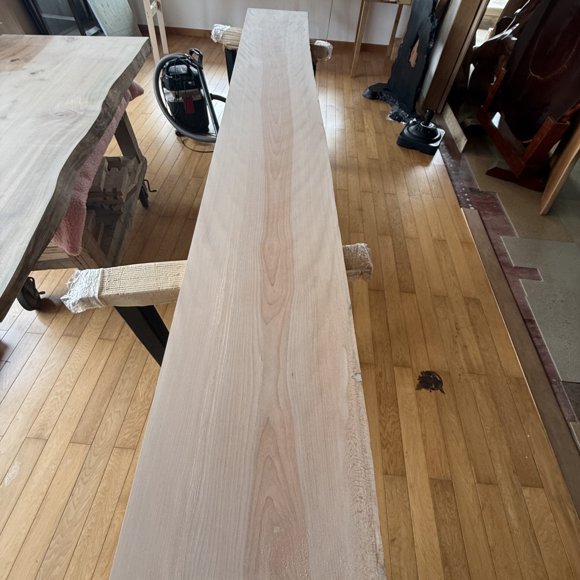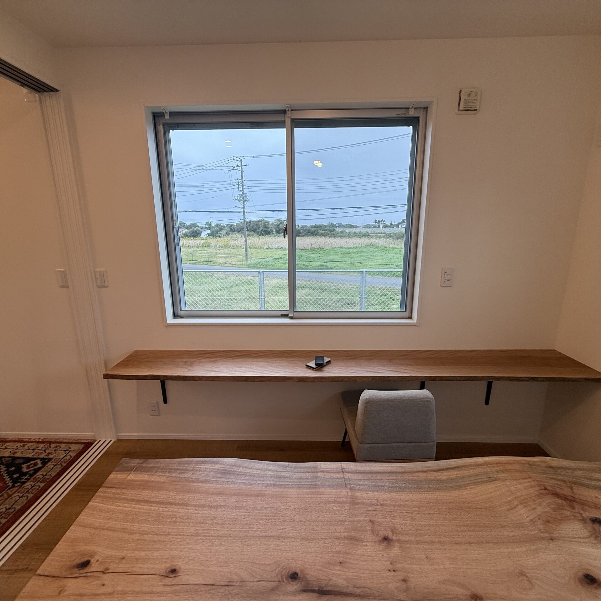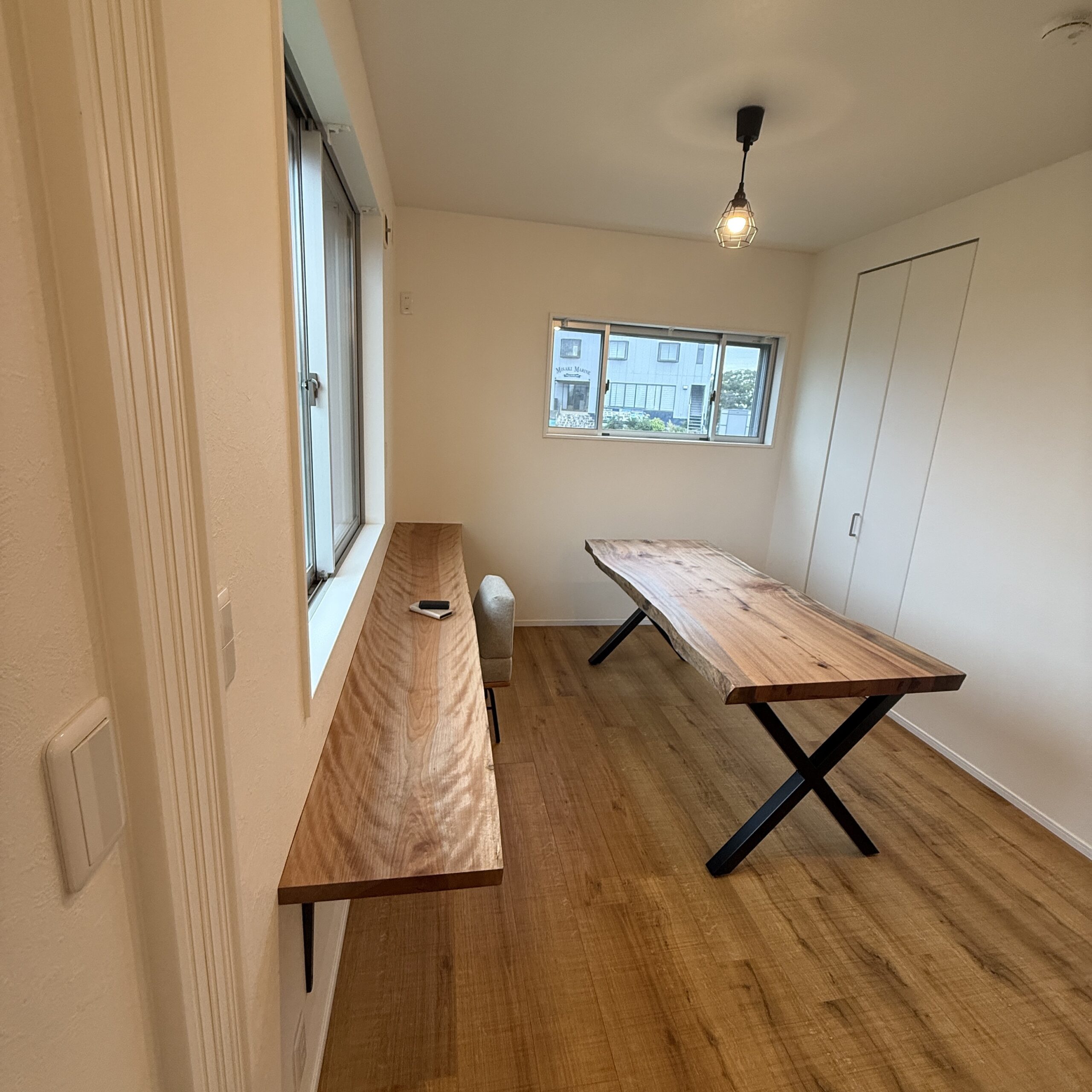 事務所のカウンターと御商談用の一枚板テーブルをオーダー頂きました。 窓の向こう側にいすみ川を望むお部屋に「カバノキ」のカウンターと「タブ」の無垢一枚板のテーブルを納品致しました。 白を基調とした内装と床材に合わせて、空間全体の調和を意識した一枚板のご提案。 素材も持つ自然な風合いが、空間に落ち着きと上質さをもたらします。 お客様と 打ち合わせを重ね 空間全体を見据えたご提案を大切にしています #一枚板テーブル #無垢材 #オーダーメイド #木のある暮らし #空間デザイン